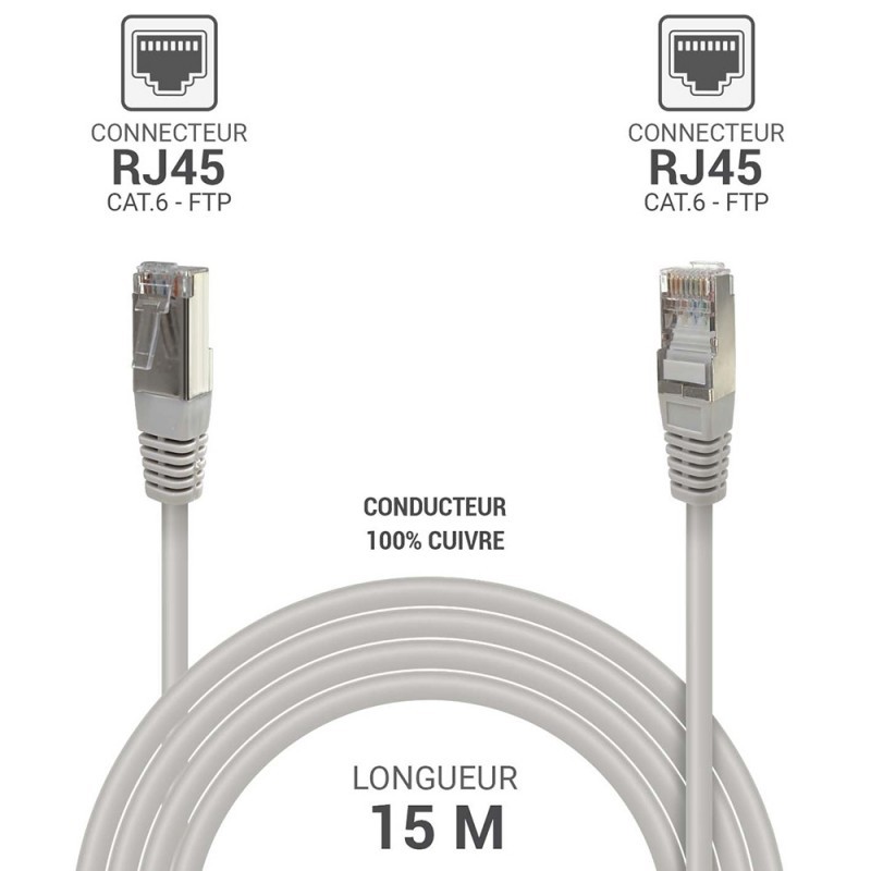 Ce câble RJ45 FTP Cat.6 de 15 mètres est une solution fiable pour établir des connexions réseau efficaces à Mayotte.Sa conception blindée garantit une performance optimale, réduisant les risques de perturbations électromagnétiques.