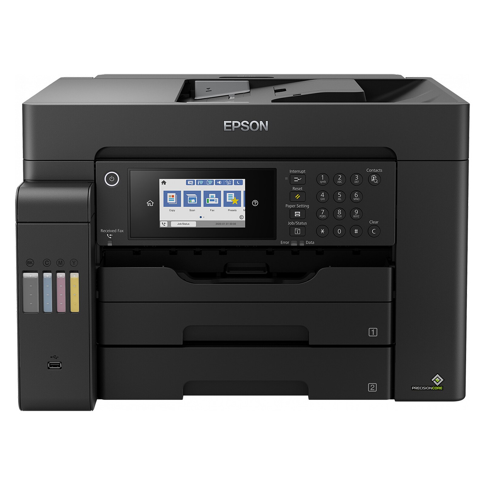 - Réservoir d’encre avant facile à utiliser : profitez de recharges simples avec des bouteilles d’encre avancées