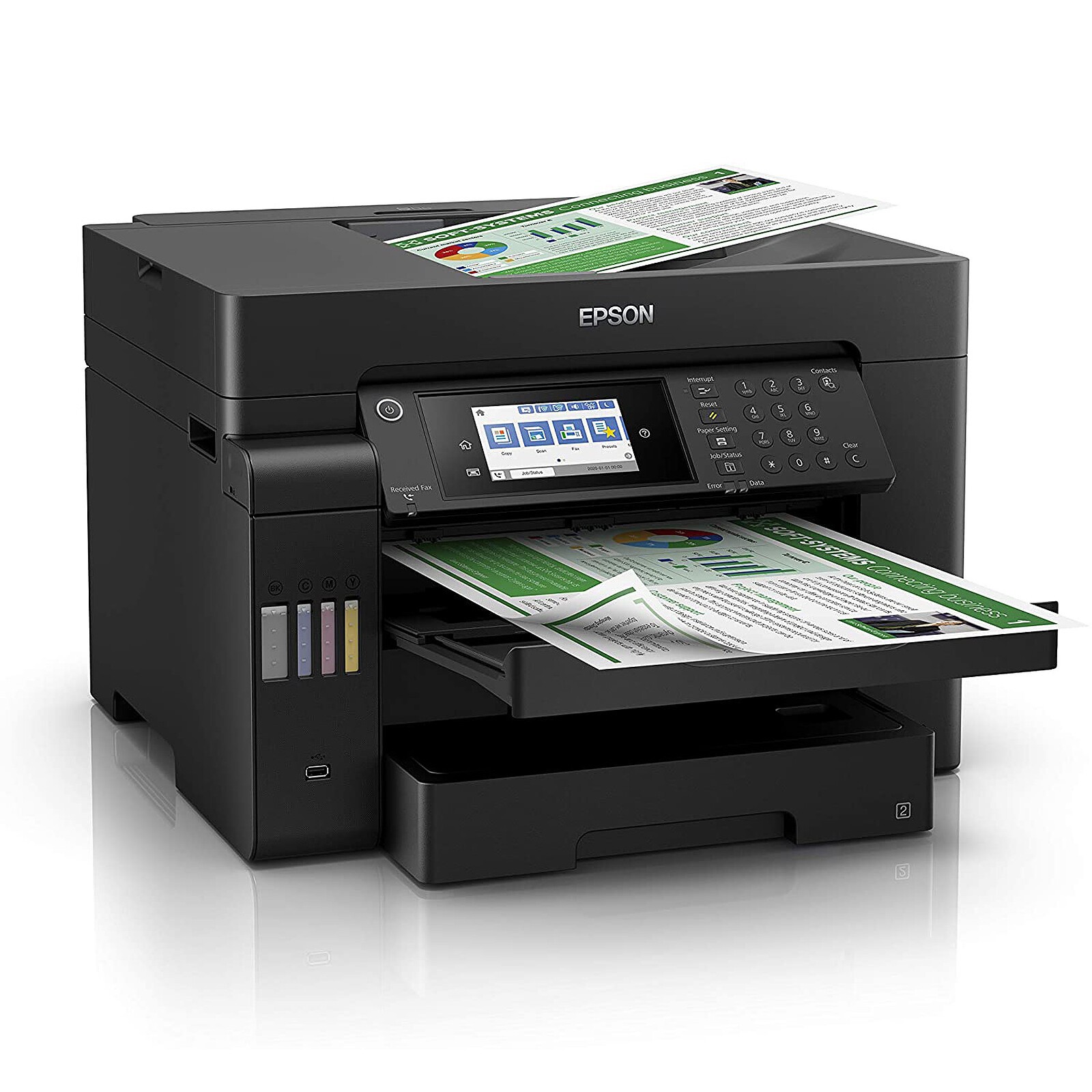 En plus d’offrir un faible coût d’impression par page, cette imprimante multifonction EcoTank gère facilement les travaux A3+. Les travaux A3+ peuvent être réalisés rapidement grâce à l’impression et à la numérisation à grande vitesse, à deux bacs à papier à chargement frontal de 250 feuilles, à un chargeur de papier de 50 feuilles à l’arrière et à un chargeur automatique de documents A3 de 50 feuilles. Imprimez comme vous le souhaitez grâce à l’impression mobile, à la connectivité Ethernet et à un écran tactile LCD de 10,9 cm avec boutons fixes